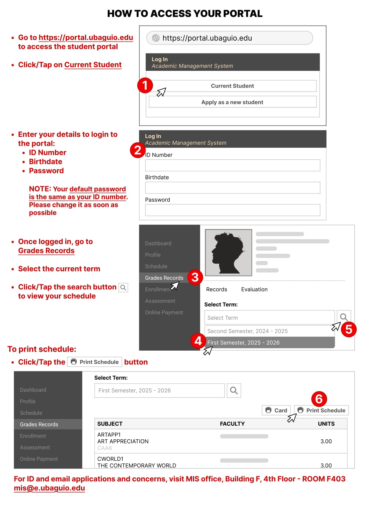 NOTE If you encounter any issues accessing your portal, please contact MIS at mis@e.ubaguio.edu or visit the MIS Office located at Building F, 4th Floor, Room F403.